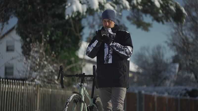 Man on bicycle ride in winter in freezing snowy weather stopped and used a mobile phone, using app to find GPS positioning, route guidance, online map and navigation while biking. Concept of journey. Pro Video