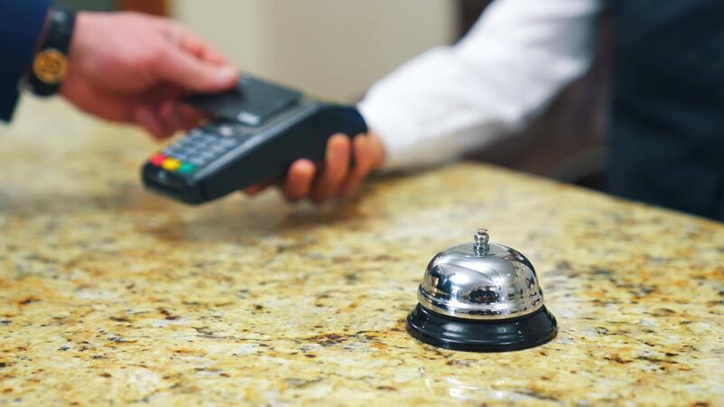 Guest makes card payment at check-in. Bell at hotel reception. Man in hotel lobby pay with nfc chip card. Blurred of payment with terminal during checking in. Pro Video