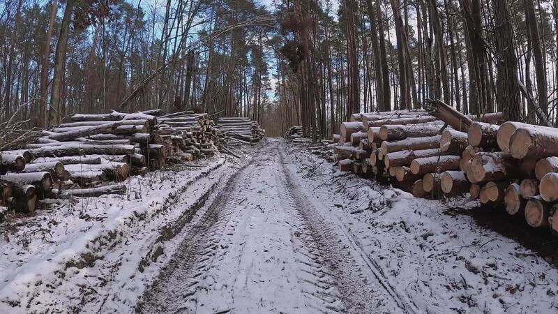 An enchanting snowy forest scene displaying a logging road that is lined with large timber piles on either side Pro Video
