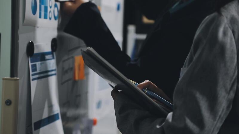 Two business leaders talk about charts, financial graphs showing results are analyzing and calculating planning strategies, business success building processes. Free Video