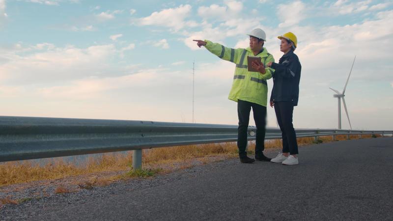 people engineer are wearing a protective helmet on head, using tablet Analytics engineering data. Free Video