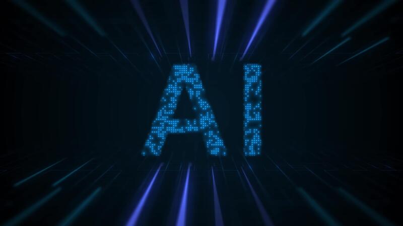 Artificial intelligence microchip animation dark background with AI lettering in small blue elements. Perfect for tech presentations, websites, or social media posts about artificial intelligence. Pro Video