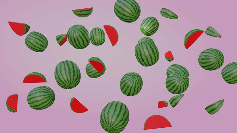 3D animation of a rotating cloud-like watermelon on a pink gradient background, complemented with a black and white luma matte Free Video