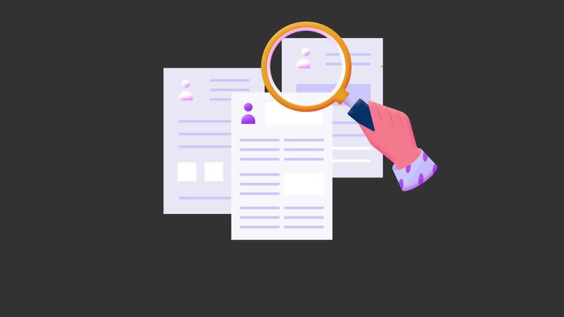 Hand is holding magnifying glass and observing candidate's cvs. Loop animation without abckground. Free Video