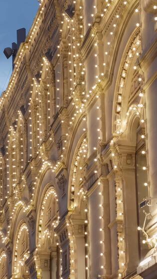 An Illuminated Historic Building Captivatingly Glows at Dusk, Creating a Charming Atmosphere. Action Pro Video