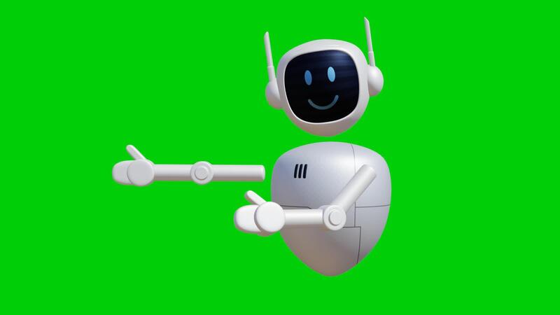 Robot assistant 3D animation with pointing to side gesture. Green screen background with perfect looping. Pro Video