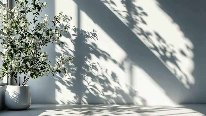 Light blue leaves casting soft shadows on a white background, creating a serene and elegant atmosphere Pro Video