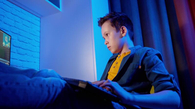 Teenager playing game on PC. Boy plays computer games using keyboard while sitting at home. Teens lifestyle and computer concept. Pro Video