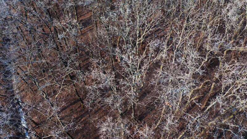 Flying over the trees without leaves. Naked branches of trees covered with frost in the forest. Top view. Slow motion. Pro Video