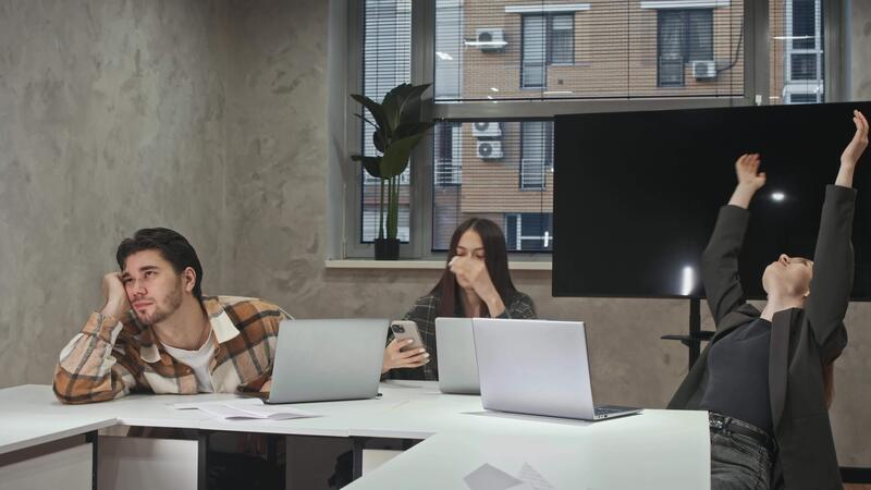 Group of bad office workers, feeling tired and sleepy, sitting at their desks in front of computers, trying not to fall asleep from idleness Pro Video