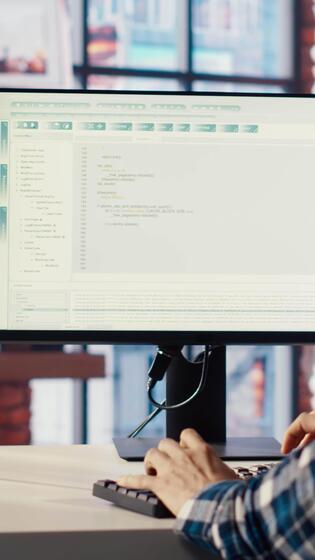 Programmer at desk typing code into computer, developing software programs, consulting green screen tablet. Man in home office fixing errors in application using chroma key device and PC, camera B Pro Video