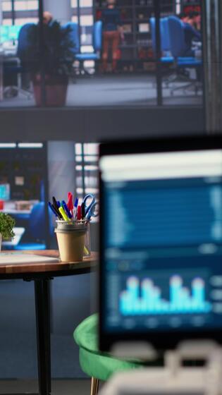 Vertical Modern office space with financial data on a monitor used for meetings, running detailed analytics and graphs. Empty workspace to develop business strategies for success, productivity tools. Pro Video