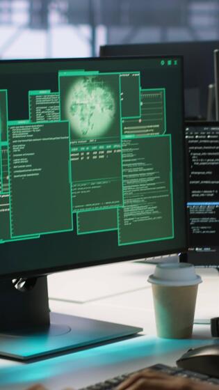 Vertical Engineers seeing system hacked popup on PC screen in data center, requesting help from cybersecurity team. Server farm worker seeing security incidents affecting network system, camera A Pro Video