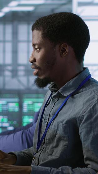Vertical Data center software developer maintaining company network infrastructure by configuring and troubleshooting hardware. Close up of woman in server hub ensuring optimal system performance, camera A Pro Video