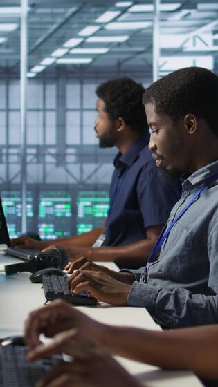 Vertical Engineers seeing system hacked popup on PC screen in data center, requesting help from cybersecurity team. Server farm worker seeing security incidents affecting network system, camera A Pro Video