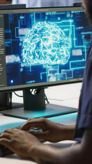 Vertical African american worker in data center implements advanced AI driven predictive maintenance systems. Engineer using artificial intelligence to identify hardware failures impacting operations, camera A Pro Video