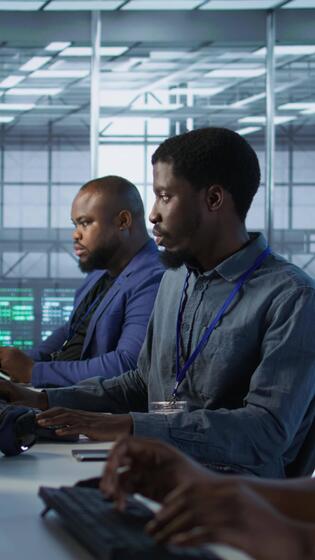 Vertical African american data center technicians implement AI predictive maintenance systems. Woman in server hub using artificial intelligence to identify hardware failures, camera A Pro Video