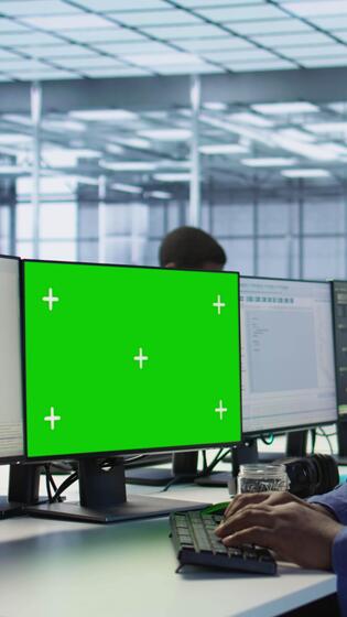 Vertical Engineer using green screen computer in server room, developing disaster recovery plans ensuring minimal downtime. Data center worker looking at mockup PC, monitoring performance, camera A Pro Video
