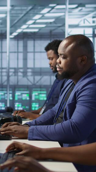 Vertical Surprised data center technician celebrating after successfully managing to install cybersecurity framework, reducing security incidents and enhancing data protection protocols, camera A Pro Video