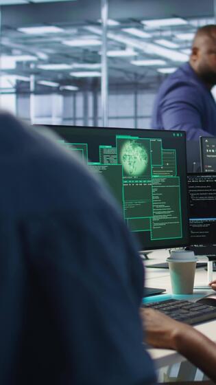 Vertical Woman requesting help from cybersecurity team after seeing security incidents affecting data center network system, protecting infrastructure from hacker attacks, camera A Pro Video