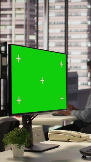 Vertical Female director seated at workstation with green screen on devices, working on solving administrative tasks for enterprise growth. Performance metrics to support project objectives. Camera B. Pro Video