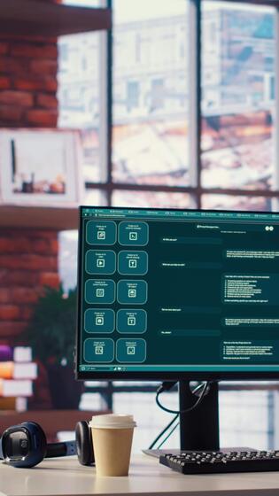 Computer setup in bright IT development workspace showing large language model program. PC in home office with AI LLM chatbot answering user prompts using neural network tech Pro Video