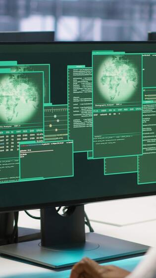 Vertical Admin in server hub trying to protect gear from hacker attack stealing sensitive information. Data center employee struggling to erase virus after seeing security breach alert on monitor, camera A Pro Video
