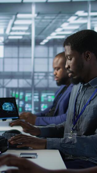 Vertical Team of engineers in data center developing and maintaining disaster recovery plans ensuring minimal downtime. Server room workers using data analytics to monitor performance, camera A Pro Video