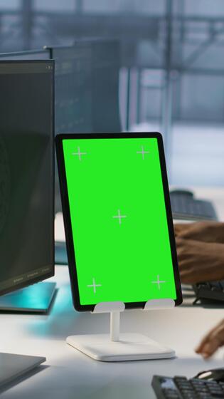 Vertical Programmers use isolated screen tablet in server room, developing disaster recovery plans ensuring minimal downtime. Data center employee looking at chroma key device, monitoring performance, camera A Pro Video