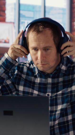 Teleworker enjoying music while researching data for company project, doing tasks in personal home office. Man sitting at desk in front of laptop and using headphones, camera B Pro Video