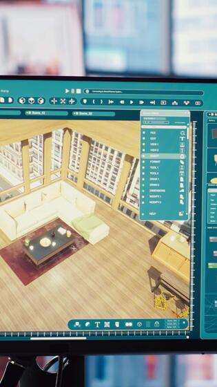 Freelancer working from home moving assets in 3D modeling program, doing interior design project. Teleworking interior designer using CAD software on PC, making home floor plans, camera B Pro Video