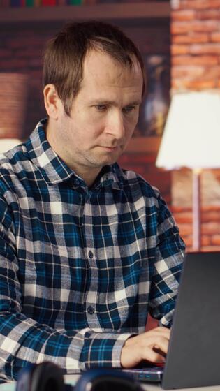 Man seated at home office desk using laptop, checking emails displayed on screen, reading messages in inbox, composing and sending replies, managing electronic correspondence, camera B Pro Video