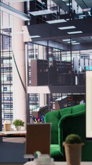 Vertical Modern office space with financial data on a monitor used for meetings, running detailed analytics and graphs. Empty workspace to develop business strategies for success, productivity tools. Pro Video