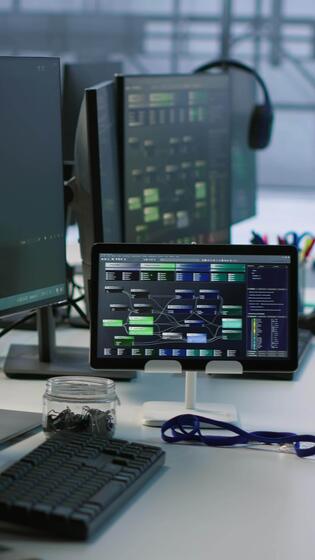 Vertical Electronic devices in empty data center establishment monitoring hardware energy consumption. PC monitors on desk used for checking potential system failures in server room, handheld camera shot Pro Video