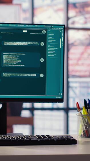 AI LLM chatbot software interface on PC in home office showing virtual assistant answering prompts. Large language model program on PC communicating with user through artificial intelligence, closeup Pro Video