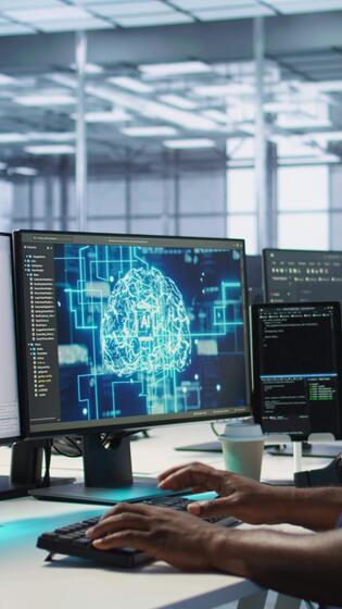 Vertical Machine learning expert in AI server room developing disaster recovery plans ensuring minimal downtime. Employee monitoring performance in artificial intelligence ran data center, camera A Pro Video