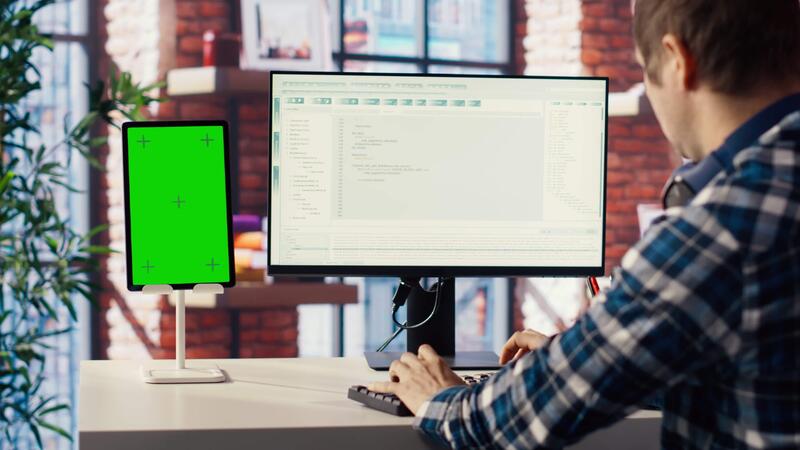 Programmer at desk typing code into computer, developing software programs, consulting green screen tablet. Man in home office fixing errors in application using chroma key device and PC, camera B Pro Video