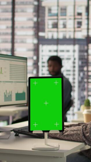 Vertical Female manager seated at workstation with green screen on devices, working on solving administrative tasks for enterprise growth. Developing performance metrics to support firm goals. Camera B. Pro Video