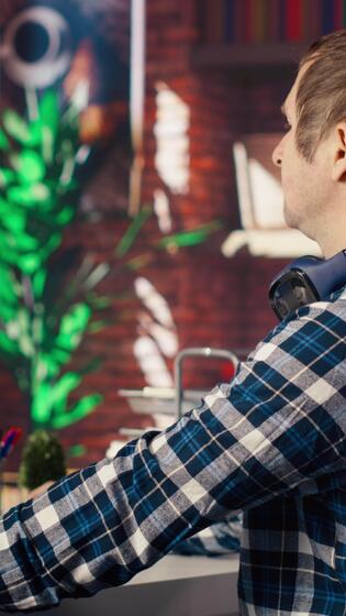 Man watching guide on mockup device about generative artificial intelligence generating videos. Man looks at tutorial on green screen tablet about AI virtual assistant producing clips, camera B Pro Video