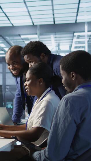 Vertical Data center coworkers laughing, having fun while maintaining company network infrastructure. Server hub colleagues enjoying time together in office, telling jokes, having conversation, camera A Pro Video