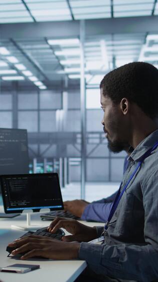 Vertical Cheerful coworkers in data center implementing AI predictive maintenance systems. Server room engineers using artificial intelligence to identify hardware failures impacting operations, camera A Pro Video