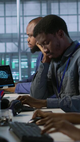 Vertical Tired data center engineer yawning, suffering from lack of sleep while maintaining company network infrastructure. Bored server hub worker feeling fatigued, struggling to stay awake, camera A Pro Video