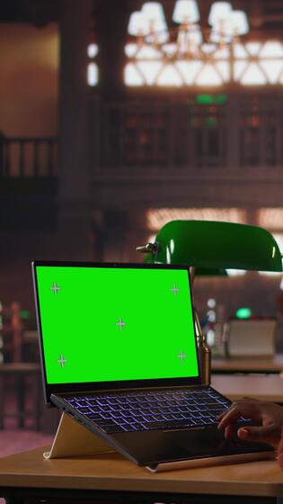 Vertical Black librarian typing on laptop with chroma key in a quiet public library, dedicated to organizing study resources and mentoring students in their academic journey with pride. Camera A. Pro Video