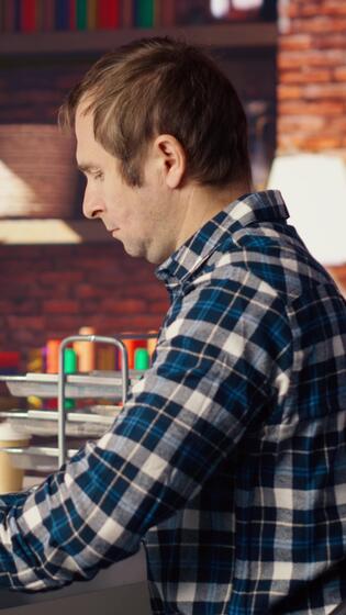 Man in home office stretches back while looking at UI on PC screen, feeling fatigued while executing programming code. IT developer feeling backpain, relieving pain, writing and testing code, camera B Pro Video