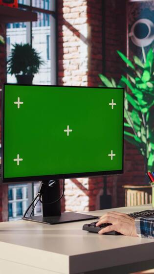 Teleworker in apartment home office using mockup PC to analyze sales report and plan business development. Man working from home doing project research, typing on isolated screen computer, camera A Pro Video