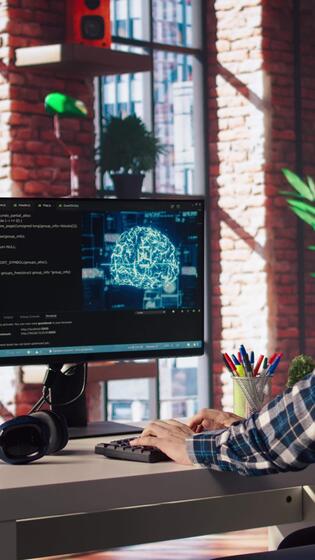 Admin using computer in home office for artificial intelligence computing simulating human brain through self learning algorithms. Employee working with AI deep neural networks on desktop PC, camera A Pro Video