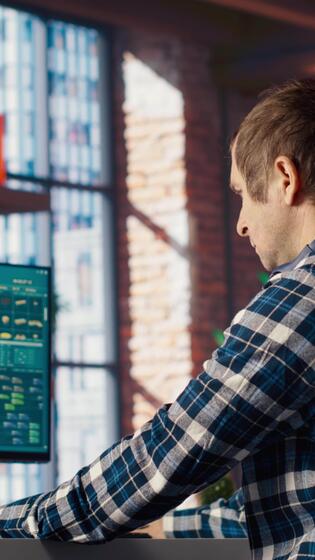 Man doing remote work on computer screen, moving assets in 3D modeling program. Teleworking interior designer using computer aided architectural design software on PC, camera B Pro Video