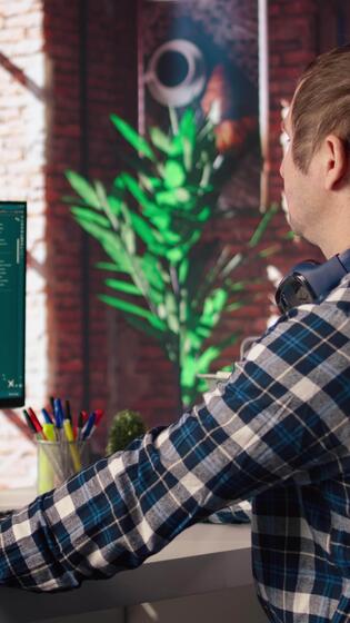 Man watching guide on mockup device about generative artificial intelligence generating videos. Man looks at tutorial on green screen tablet about AI virtual assistant producing clips, camera A Pro Video