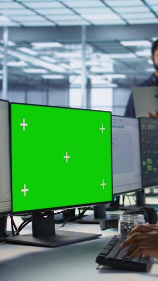 Vertical System administrator in server hub ensuring data remains shielded from potential threats using chroma key PC. Woman safeguarding data center against hackers with mockup computer, camera A Pro Video