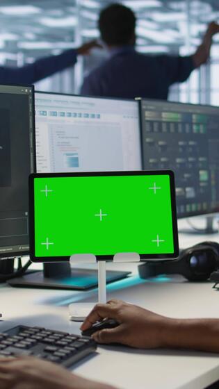 Vertical IT experts using green screen tablet, working together in server farm to optimize it for data processing requirements. Close up of coworkers coding on chroma key device in data center, camera A Pro Video